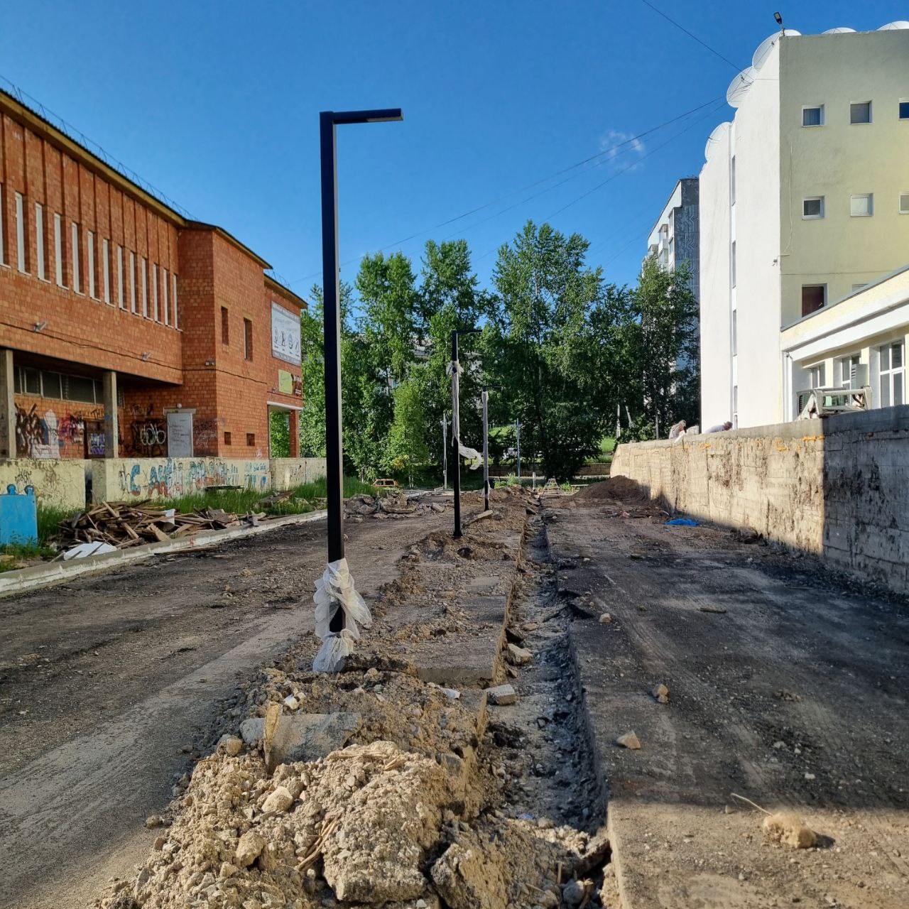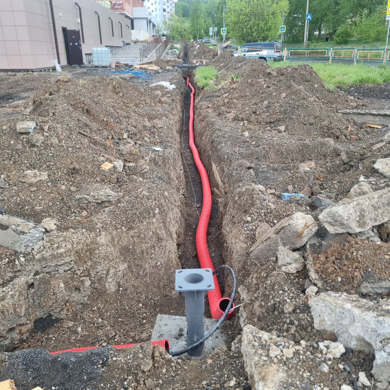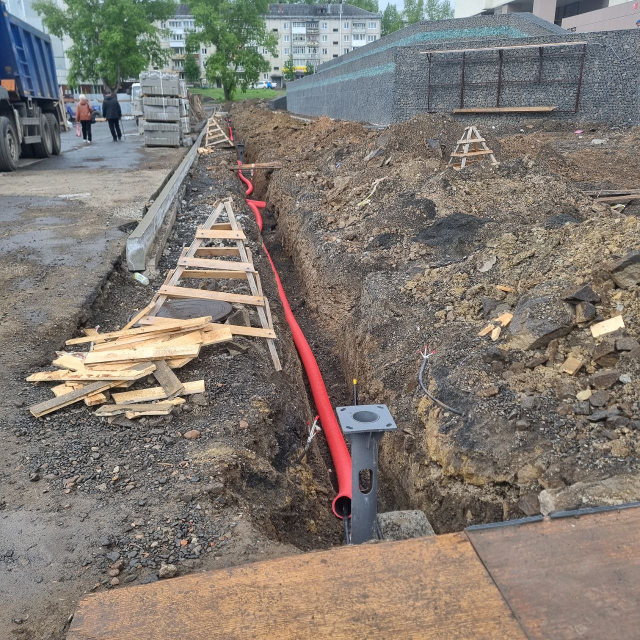 Залиты бетоном закладные опор освещения, начата укладка гофры в траншеях и протяжка Читать далее «Информация о выполнении работ по капитальному ремонту»
