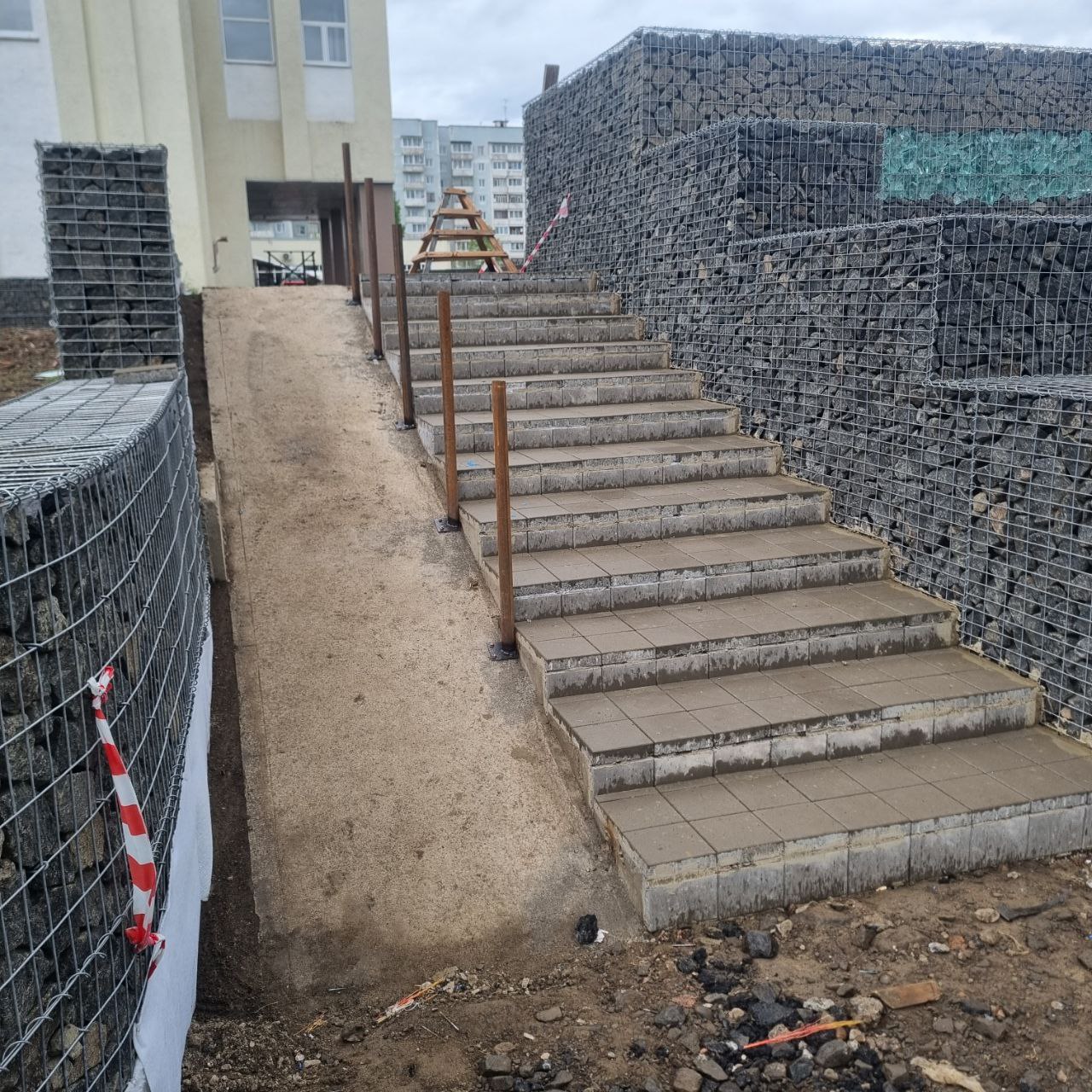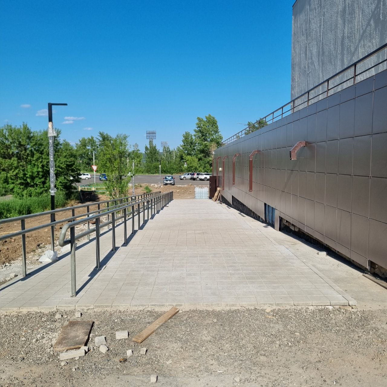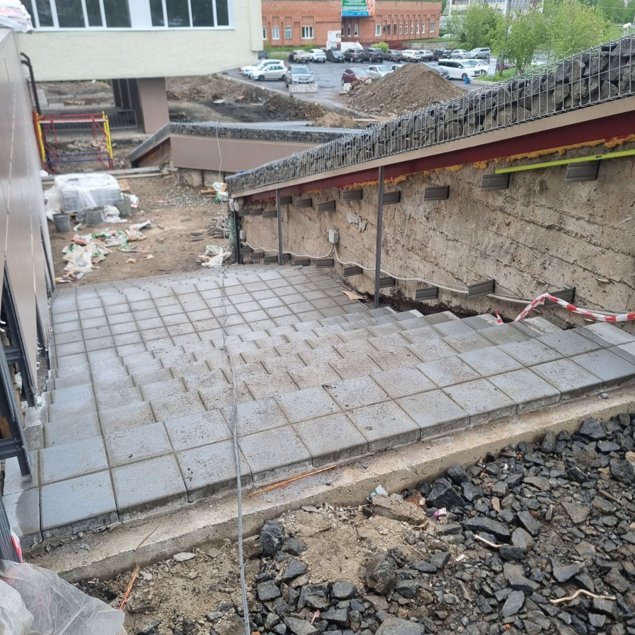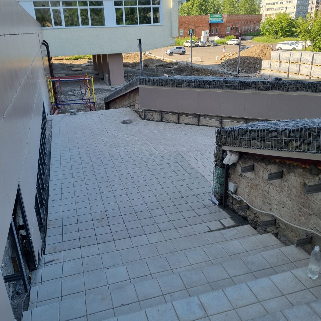 Самая длинная новая лестница Л1 Дворца культуры почти закончена. Брусчатка уложена по всей длине, а это почти 30 метров, включая пандус. Остались небольшие работы по затирке и отделке швов. На самом пандусе с двух сторон смонтированы ограждения с поручнями в двух уровнях. Они загрунтованы и будут покрашены в неброский серый цвет. Ведутся работы по монтажу ограждений пандусов на лестницах Л5 и Л6. Из всех лестниц и пандусов пока не выполнена лестница Л7. Она будет обустроена в торце насыпного тротуара в торце здания Дворца культуры по завершении работ на террасах, так как пока указанный участок используется для проезда тяжелой техники и перевозки грузов.