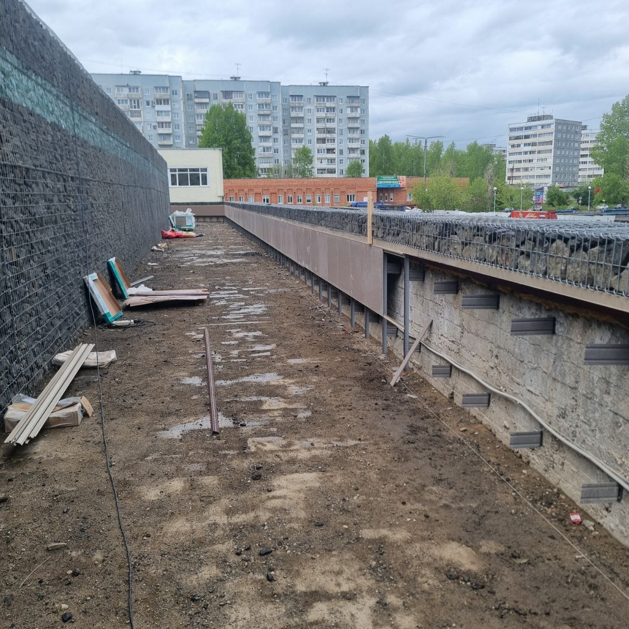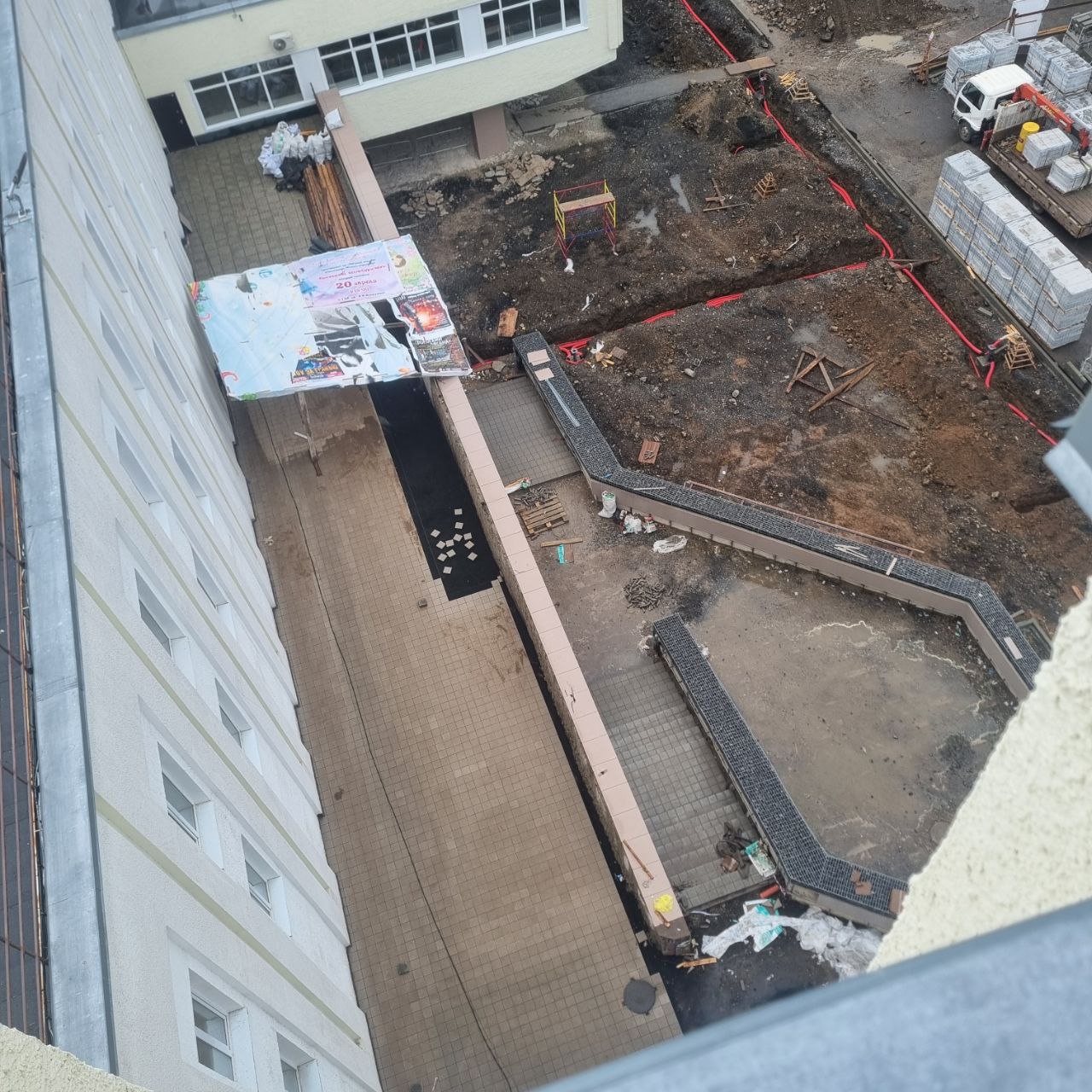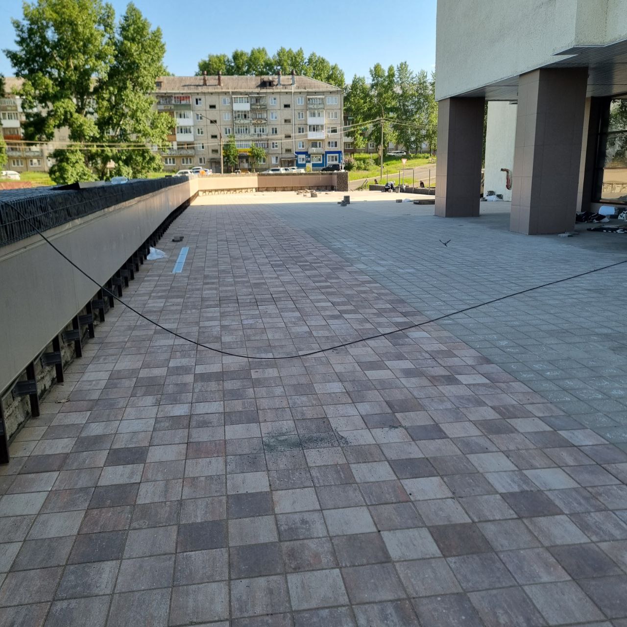 Начаты работы по укладке брусчатке на террасе, образованной подпорной стеной П4. По всей длине террасы сформировано основание, а сама брусчатка уже уложена на отрезке от лестницы Л9 до участка, где выходит вентиляционная шахта из подвала здания Дворца культуры. В этом месте планируется выполнить работы по обводке основания шахты. На самой лестнице Л9 брусчатка перекладывается для устранения выданных замечаний.