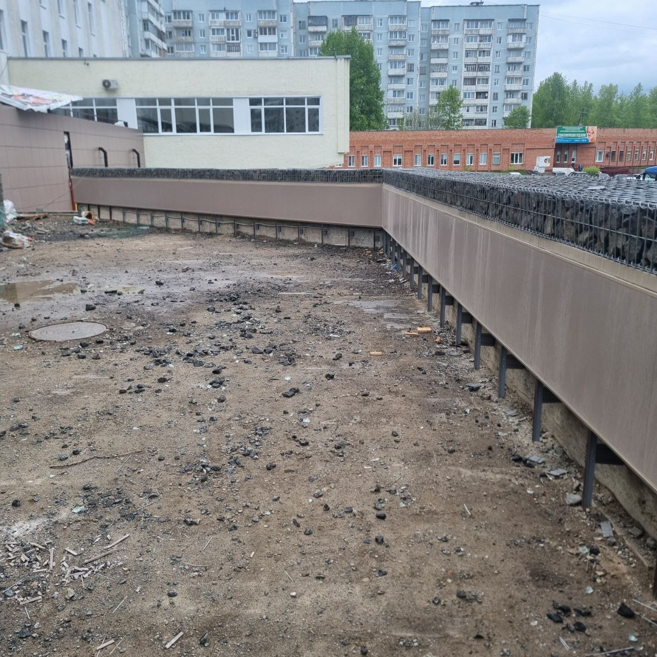 После окончания работ по монтажу брусчатки на террасах будут завершены работы по монтажу вентилируемого фасада и установлен нижний ряд керамогранитных плит.