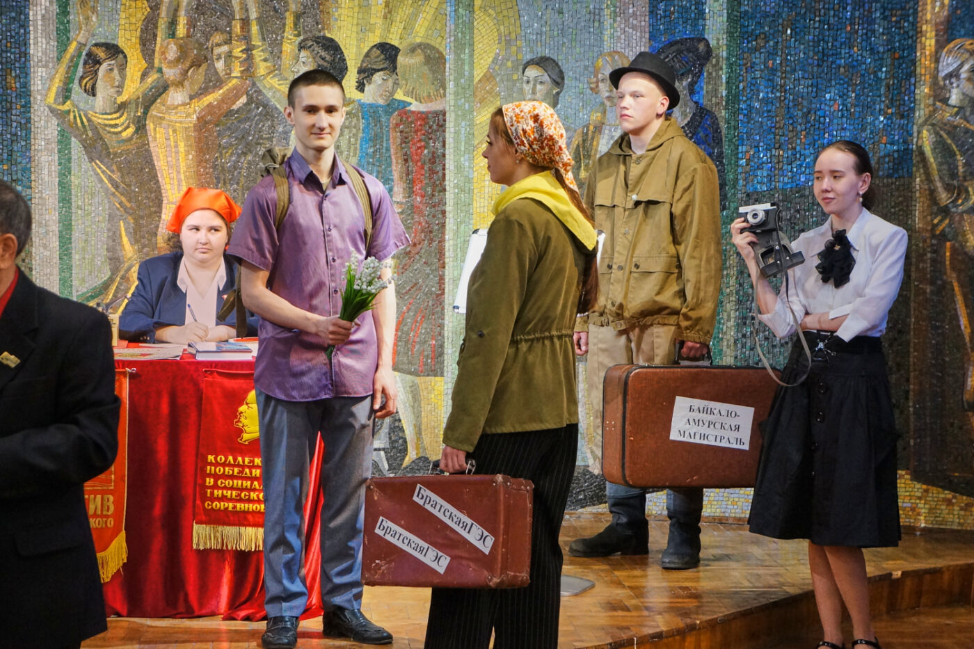 Встреча с историей, молодостью и романтикой началась с первых минут пребывания на мероприятии. Гости праздника стали свидетелями и участниками комсомольского прошлого: картины Великой Отечественной войны, приём в комсомол, распределение в строительные отряды по комсомольским путёвкам, комсомольская свадьба… Историческую достоверность действию придавали декорации и предметы из комсомольского времени. Выставка графических работ «Город на Ангаре» органично вписалась в сюжет происходящего: многие посетители узнавали в рисунках знакомые дворы, окна своих домов.